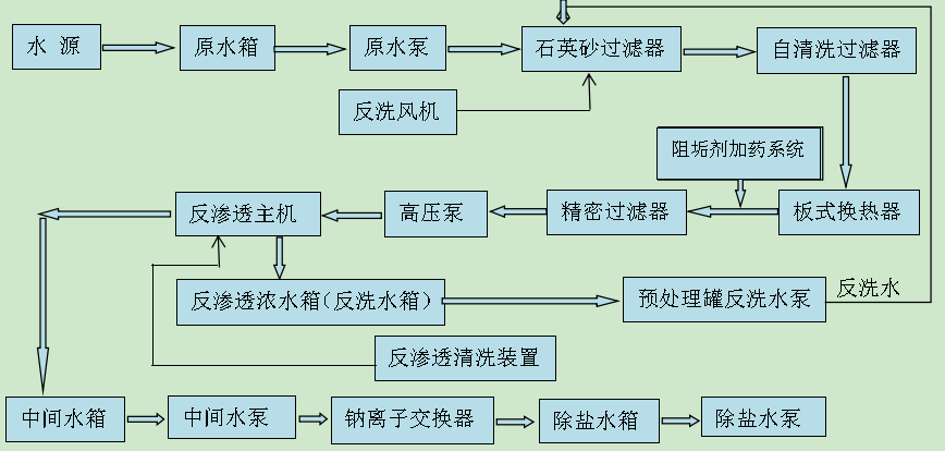 原水池+原水泵+ 多介質(zhì)過濾+板式換熱器+ +增壓泵+阻垢劑加藥裝置+5µm保安過濾器+高壓泵+反滲透裝置+反滲透水箱+中間水泵+鈉離子交換器+除鹽水箱+除鹽水泵